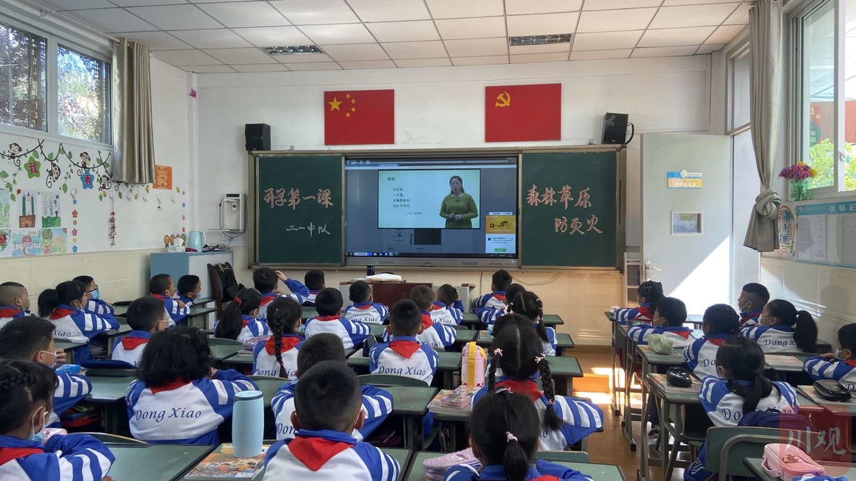 在进入教室和学生一起上主题课、观看教育视频环节。四年级1班开学第一课课堂上,班主任熊莉带着同学们做问答游戏。“如果在家遇到火灾,哪些地方可以躲避?”“厨房、卫生间 !”20多个学生争先恐后地抢答。10岁的杨峻熙给其它同学分享了更多安全知识:“我知道不能携带火种进山,小朋友不能玩火。如果在山上遇到火灾,要弯着腰往山下跑。在其它地方看到起火了,要及时拨打救火电话119。”课堂最后,同学们纷纷表示,要和大家一起,保护森林,保护大自然。