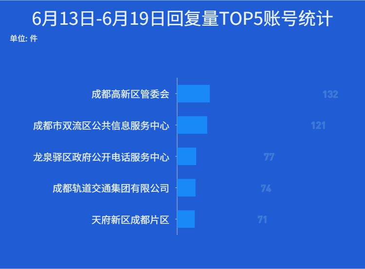 从具体接件办理单位来看,全川回复量排名前五的账号分别为: