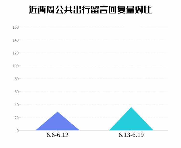 数据显示,6月第三周公共出行话题热度高,相关留言回复量较6月第二周上涨了24.19%。其中,主要涉及地铁和公交等出行方式,包括线路规划、运行时间、发车间隔等方面。