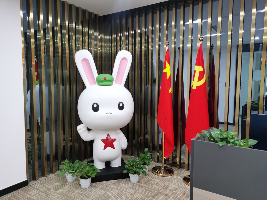 成都高新区知识产权金融大厦,林超公司的新家就安在这里。公司大门贴了“神州崛起似龙飞、赤县奔腾如虎跃”的对联,公司随处可见头戴军帽、胸佩五角星的“那兔”周边,这是一个生机勃勃的“那兔”世界。