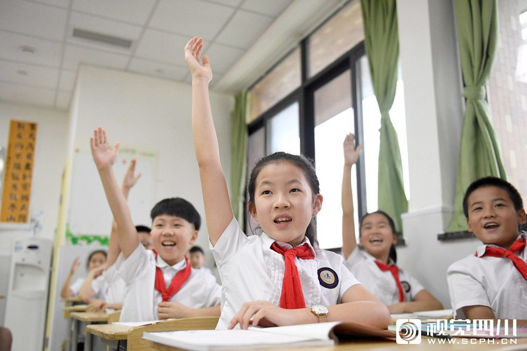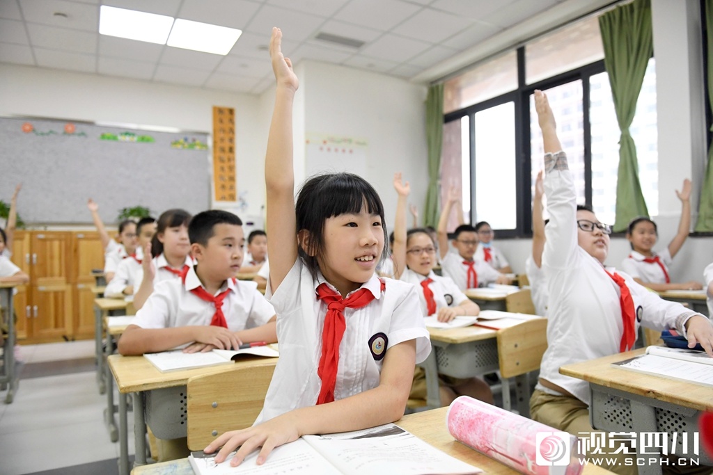 9月1日,在成都外国语学校高新美年校区,小学生在课堂上积极举手回答问题。