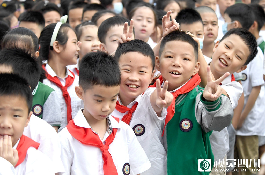 9月1日,在成都外国语学校高新美年校区,小学生在校园里准备参加开学典礼。