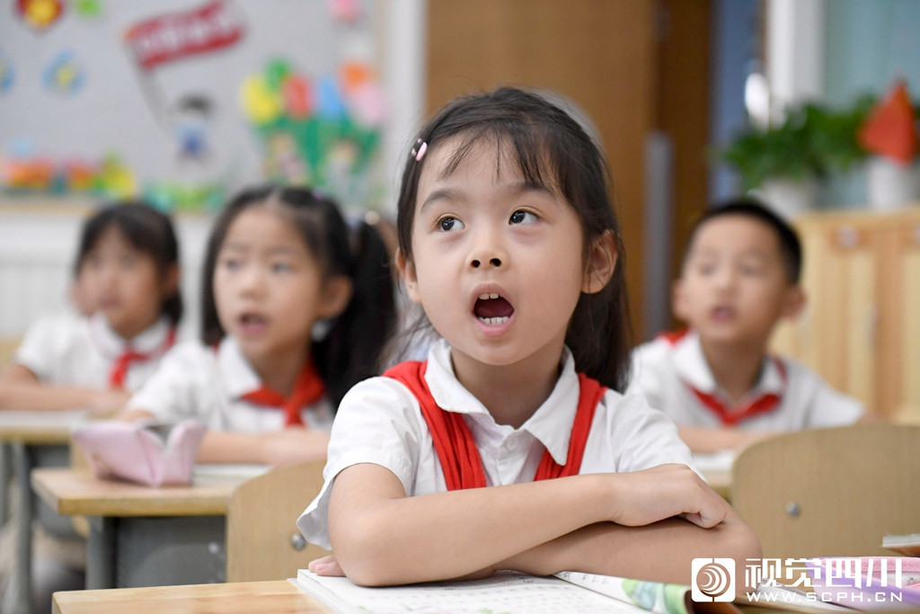 9月1日,在成都外国语学校高新美年校区,小学生积极回答问题。