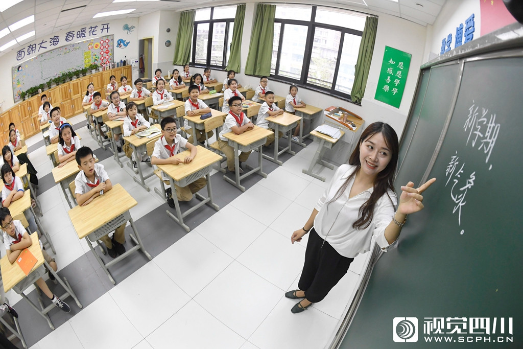 9月1日,在成都外国语学校高新美年校区5年级5班,小学生在语文老师蒙阳的带领下上课。