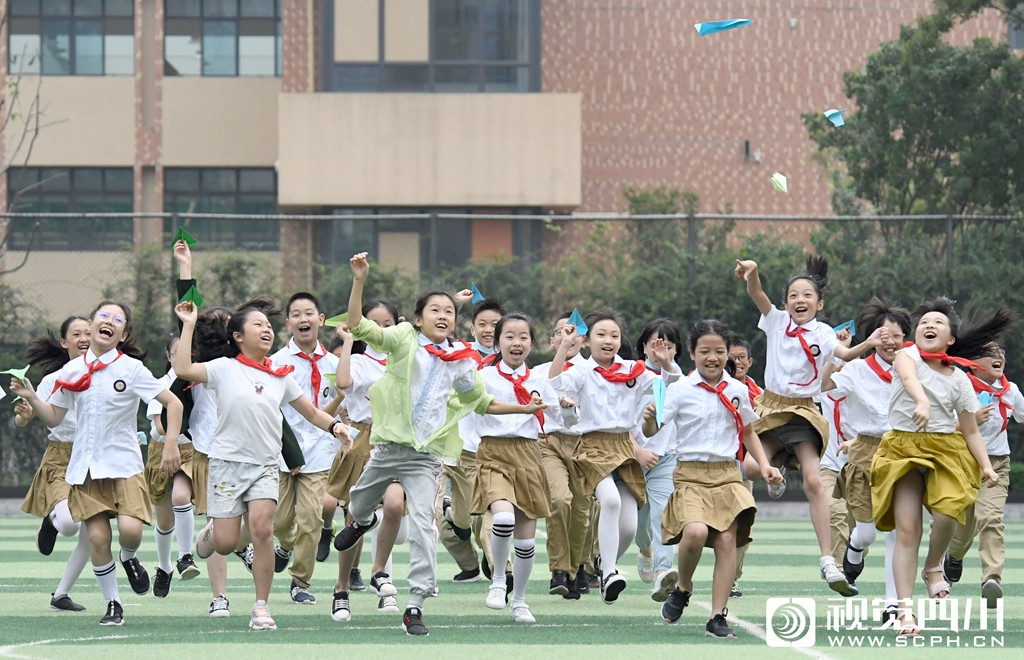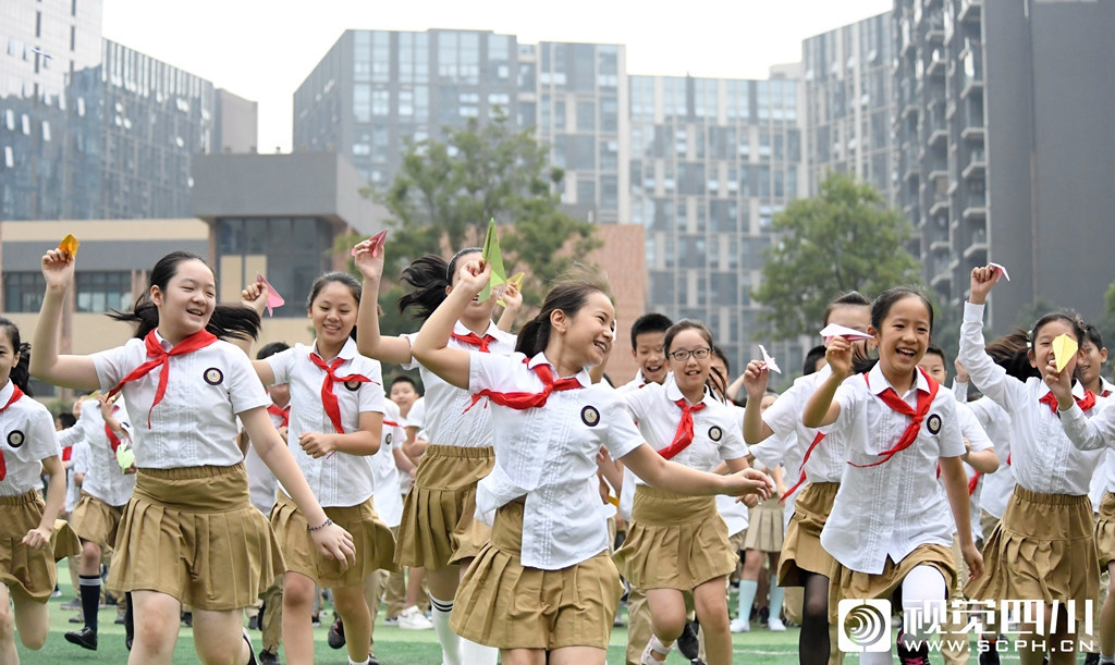 9月1日,在成都外国语学校高新美年校区,孩子们放飞写满梦想的纸飞机。