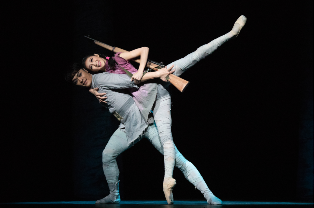 用什么样的突围方式去实现前述目标呢?辽芭的答案是用舞台上从来没有出现过的艺术形式——芭蕾舞剧去重新诠释“八女投江”的英雄事迹。在中国的芭蕾舞剧舞台上,用芭蕾舞的艺术形式去表现红色题材,应该说除了《红色娘子军》,辽芭的《八女投江》是迄今唯一的一部。在笔者看来,同样是“娘子军”的题材,辽芭版的《八女投江》走了一条不同寻常的路。用舞剧的表现形式一方面突出了辽芭作为国内三大芭蕾舞团之一的专业特点,另一方面,也更容易实现作品的人物形象塑造。其他关于“八女投江”故事的舞台戏剧形式,有一个共同点,那就是都以歌唱为主。可是,作为女性担纲全剧主角的戏,如果没有男声的映衬,就过于单薄了,但是如果男声衬托过多,又有喧宾夺主之嫌。无疑,他类的舞台戏剧形式,不可避免的面临这样的两难选择。而最理想的舞台调适结果顶多也就是平均着力,但这也难以突出“八女”的丰满形象。而用“舞剧”的创作形式,恰恰很好地规避了舞台表演的弊端。女性以柔克刚、柔能克刚的审美表现优势,让观众先天就具有认同感,是以,当她们在舞台上,用柔美却不乏刚毅的舞姿,表现对革命的坚定对信仰的执著时,自然容易激起观众的审美共情。
