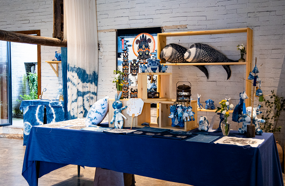 一块白布、一卷白线、些许染料,便能产生一种富于变化,且充满韵味的美。在甜立方美术馆,扎染包、扎染帽、扎染衣裙等琳琅满目的服饰用品布满整个房间,里面还陈列有烙画、石头画、团扇等。