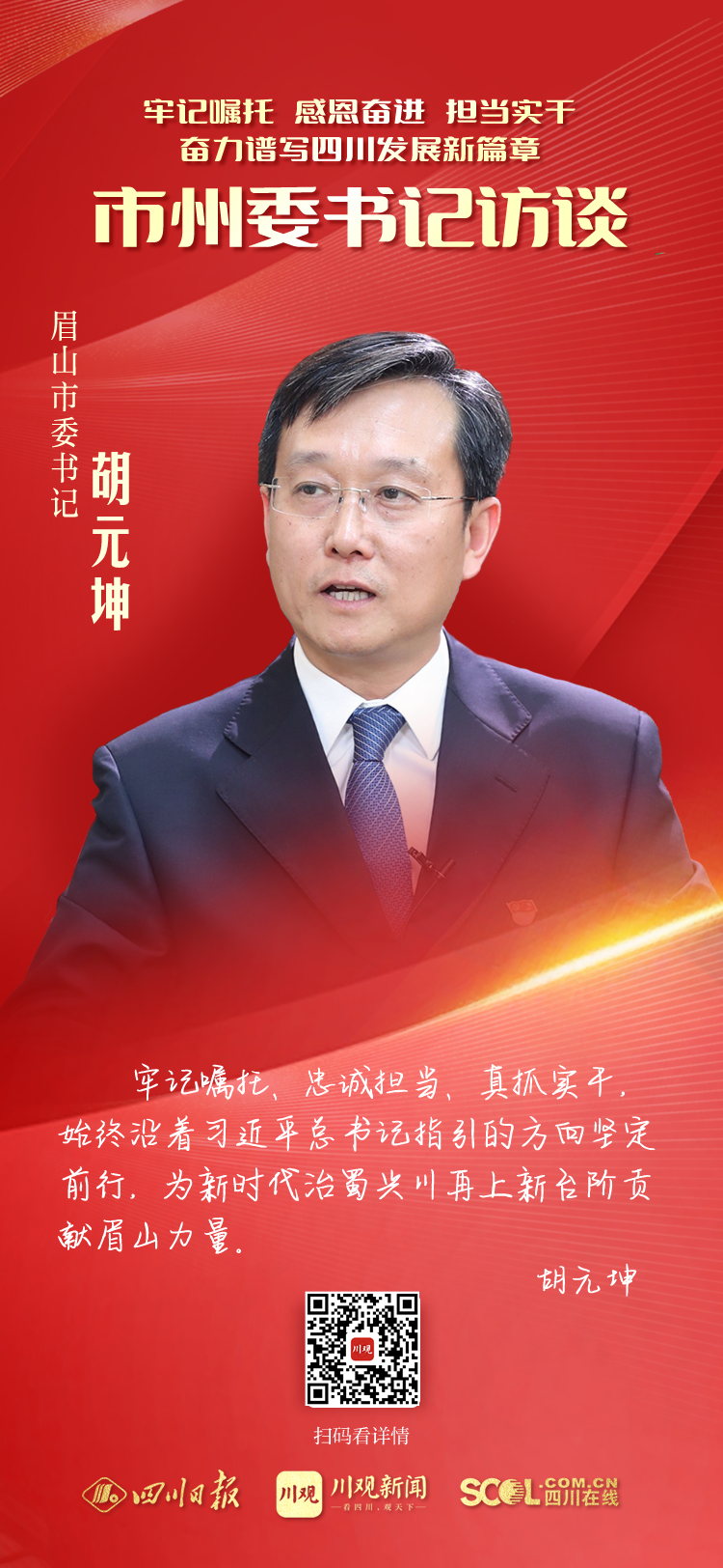6月8日,习近平总书记来到四川视察,首站就到了眉山市永丰村。5月27日至30日,四川省第十二次党代会召开,为全省未来五年发展擘画了美好蓝图。眉山如何在新征程上全力推动高质量、高水平发展?如何为新时代治蜀兴川再上新台阶贡献眉山力量?近日,川观新闻记者专访了眉山市委书记胡元坤。