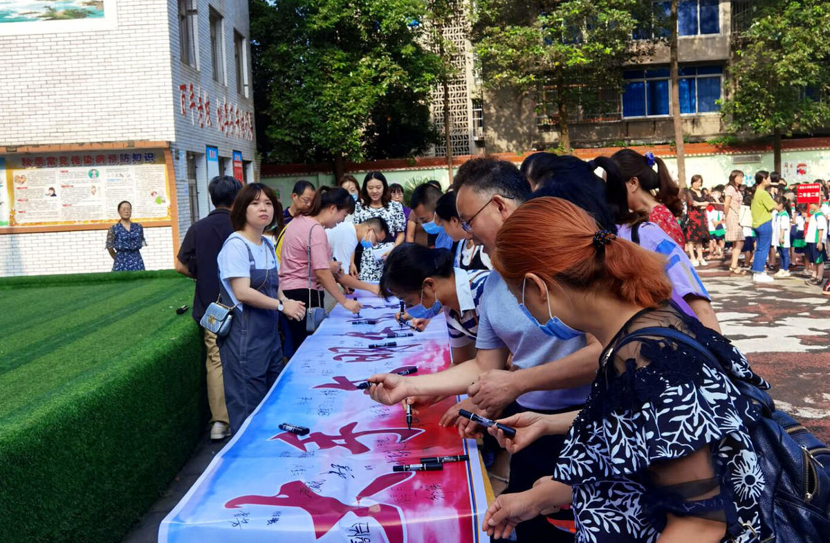 在城东小学,“小手拉大手 文明伴成长”主题教育活动在开学首日启动。全校师生依次在主题横幅上签下自己的名字,承诺做一名文明的践行者和传播者。