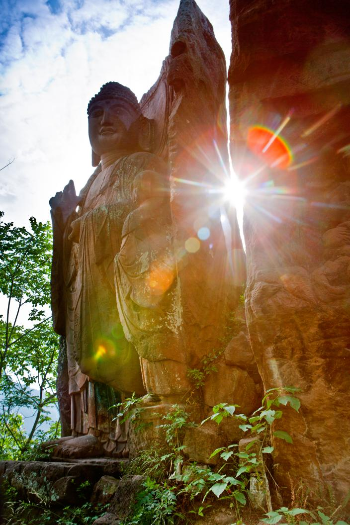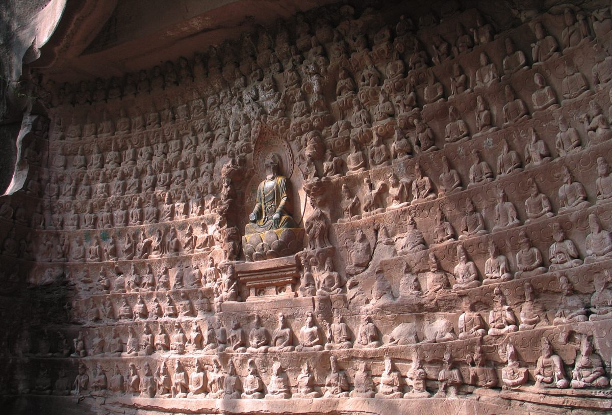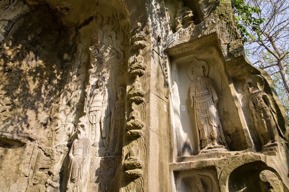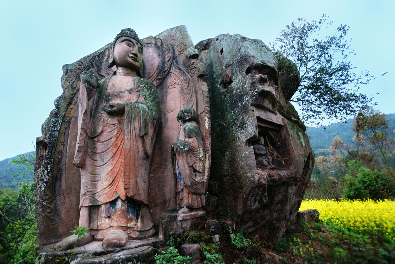 能仁寺摩崖造像位于眉山市仁寿县新店镇,能仁寺现存造像分布在原“罗汉堂”右侧山壁,在长29米,高6米的范围内共28龛。其中大佛三龛,均为主像,结跏趺坐于须弥座上,大耳垂肩、面部圆润、双目微睁、鼻正直、颈有蚕纹,或者圆领袈裟,或着袒右肩式袈裟、衣褶少而粗、褶纹线条阴刻,或直式或呈阶梯式。