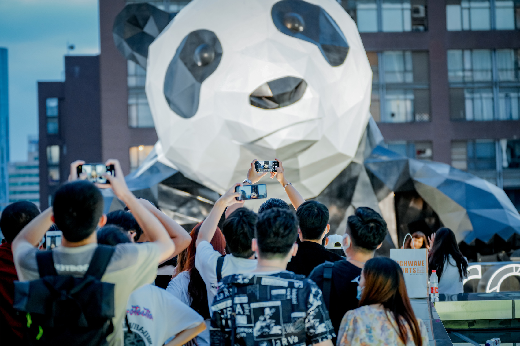 成都商场“爱上”艺术早有先例。2014年,成都IFS与著名艺术家劳伦斯合作,大胆推出“I AM HERE(我在这里)”爬墙熊猫雕塑作品,成为成都红星路步行街区的一大网红打卡点。这只“熊猫”从最初的临时展示,到后来成为春熙路商圈的“地标”,引来无数游客争相与其合影,高峰时往往需排队数小时。