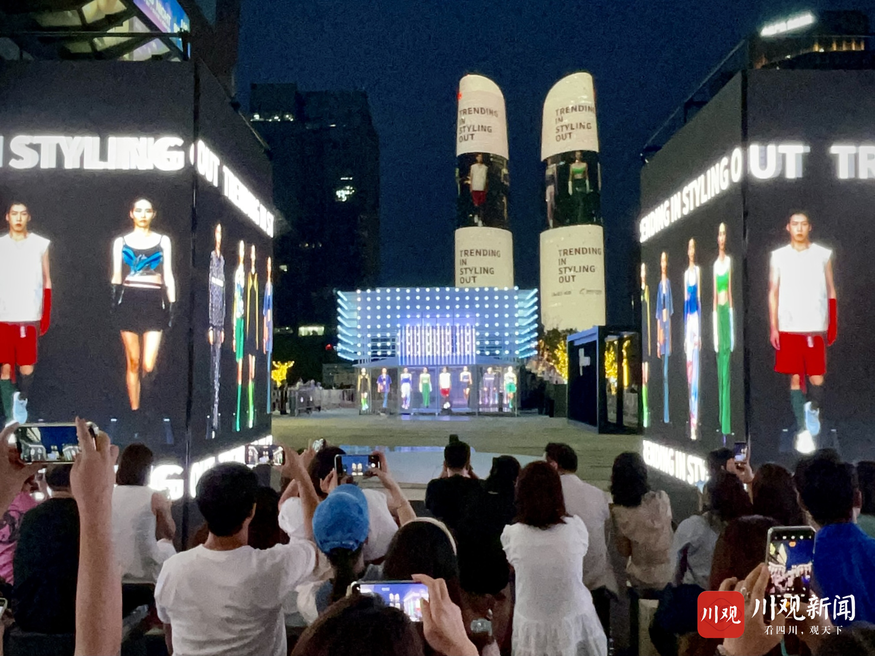 6月17日晚,“繁荣交子”“肆意生长”两行大字点亮了成都金融城地标建筑天府双塔。一场用建筑表面LED大屏作为媒介的虚拟时装秀,与交子大道上“肆意生长”影像先锋艺术展进行联动表演,引得市民纷纷举起手机拍摄留影。据悉,这是悠方购物中心为庆祝入蓉四周年打造的艺术主题活动。