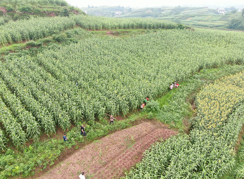 6月22日,内江市隆昌市响石镇桃园村的一处山坡上,顶着炎炎夏日,50余名村民在绿油油的高粱地间忙碌,率先开始播种夏大豆。只见他们协同劳作,拉绳定距、开沟、施底肥、规格播种、覆土等,播种工作有条不紊。