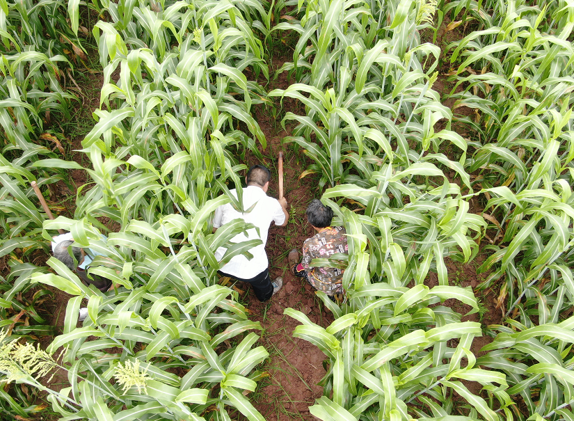 同一时间,另一处的玉米地里,村民们也在进行着同样的工作,转眼间,一行行整齐划分、宽窄相间的大豆玉米(高粱)带状复合种植结构已然形成。