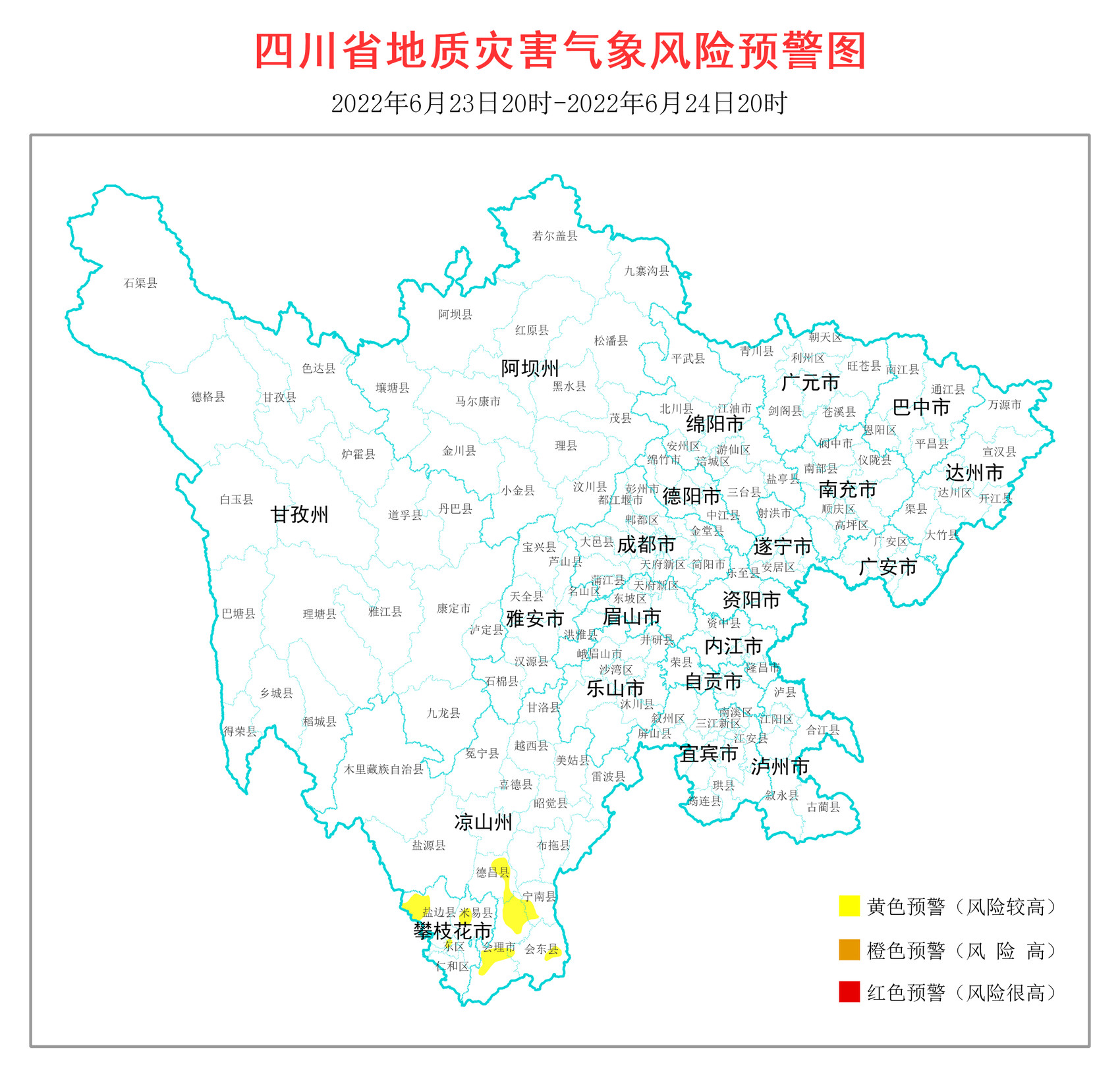 6月23日17时,根据四川省地质环境条件,结合四川省气象台天气预报情况,省地质灾害指挥部办公室发布地质灾害气象风险黄色预警,涉及2市(州)7个县(市、区)。