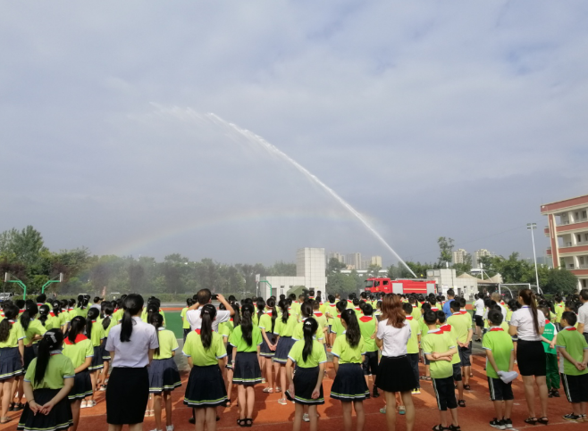 消防员为同学们展示消防水炮
