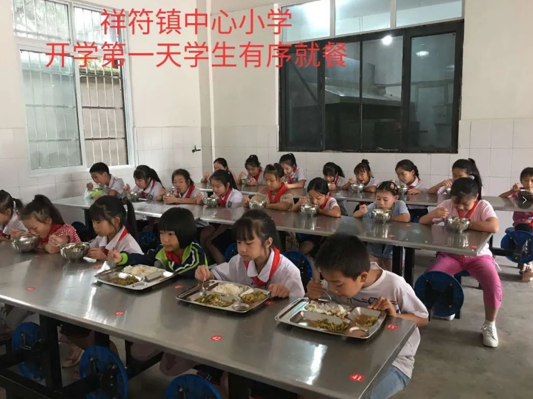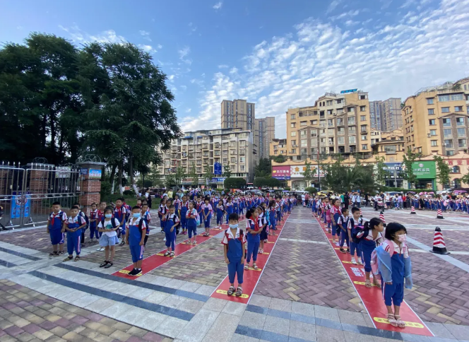 9月1日7点30分,雁江区吴仲良九义校门口,学生按照地面指示标志有序排列,并按照前后一米安全距离排列。