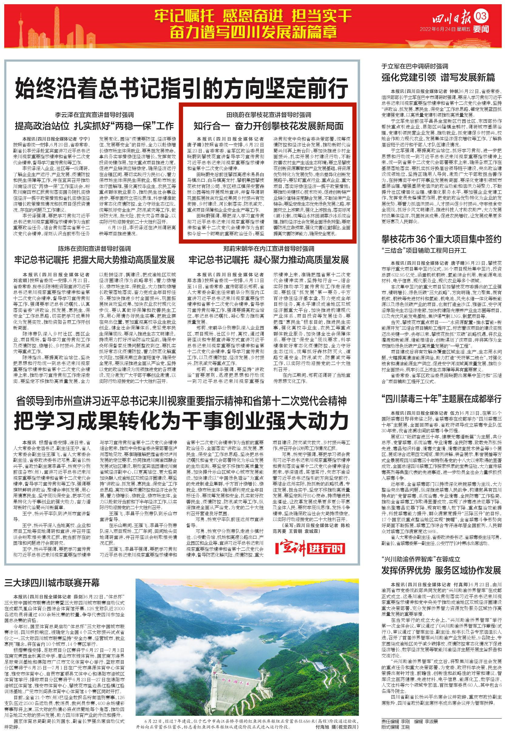 田晓蔚强调,要把深入学习宣传贯彻习近平总书记来川视察重要指示精神和省第十二次党代会精神作为当前和今后一个时期的重要政治任务;要坚决贯彻党中央和省委决策部署,统筹疫情防控和经济社会发展,推动新时代治蜀兴川再上新台阶;要加快推进乡村全面振兴,扎实开展乡村建设行动,不断改善农村生产生活生态环境;要立足攀枝花创新资源禀赋和产业发展基础,将资源优势转化为发展优势,走出差异化创新发展路子;要紧盯重点行业、重点企业、重大项目,落实好稳住经济一揽子政策措施;要推动关键核心技术攻关,促进创新链产业链价值链深度融合发展,不断延伸产业链条;要坚定走生态优先绿色发展之路,牢固树立上游意识,强化上游担当,落实好河(湖)长制,统筹山水林田湖草沙冰系统治理,推动经济社会发展全面绿色转型;要完善防汛应急预案,强化灾害巡查排险,全面提高灾害防御能力,确保安全度汛。