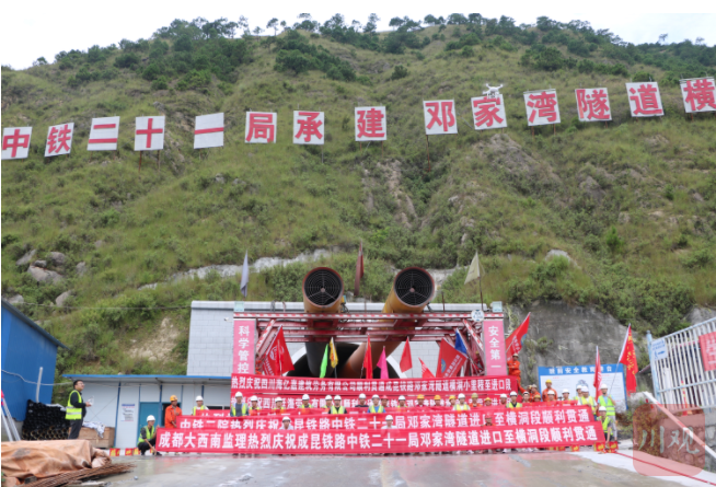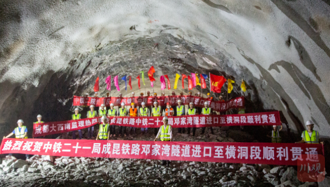 成昆复线仅剩未开通的峨眉至米易段施工迎来新进展。9月2日10时许,由中铁二十一局集团承建的成昆复线邓家湾隧道进口端与横洞小里程掌子面贯通,为成昆复线2023年全线通车奠定基础。