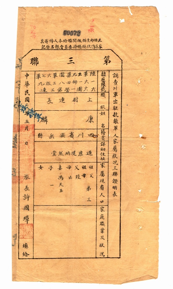 1939年5月第67军161师483旅旅长许国璋签发的调查川军出征抗敌军人家属状况三联证明表