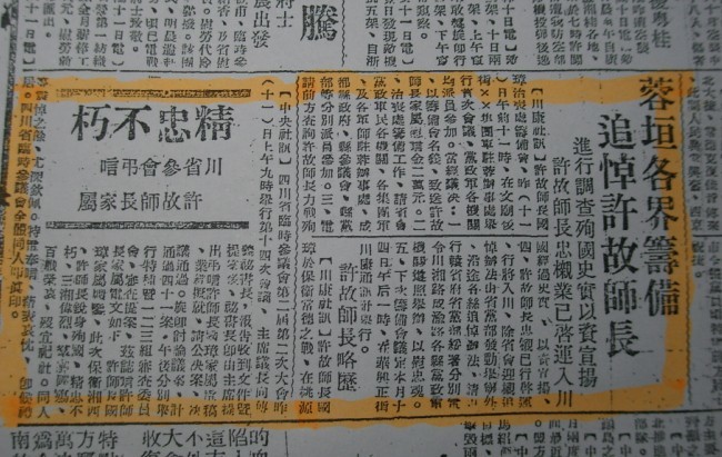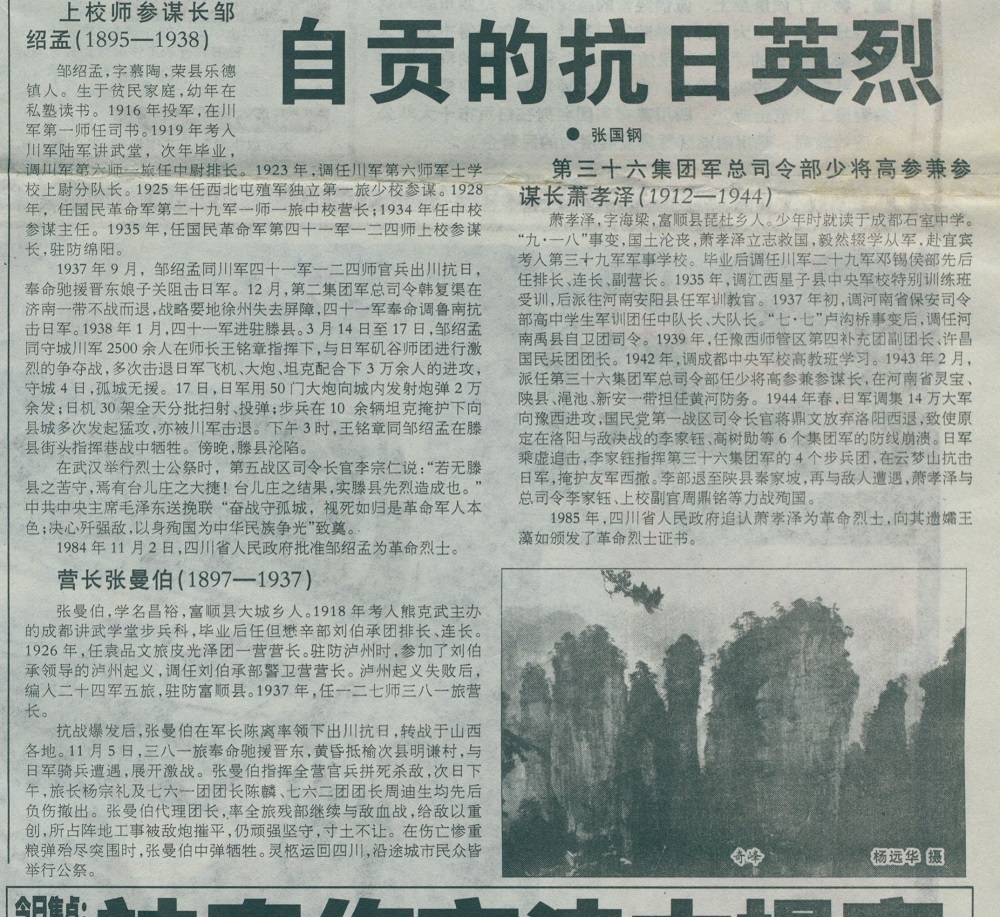 自贡市档案馆撰写的《自贡的抗日英雄》刊登在自贡日报上,右边为肖孝泽事迹