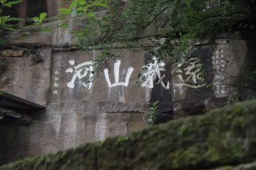 省级文物保护单位邻水县灵宝山石刻“还我山河”题刻。该题刻右边有小字题款:“中华民国二十八年二月,欢迎抗战军人陈绍堂先生便道游此志感。”