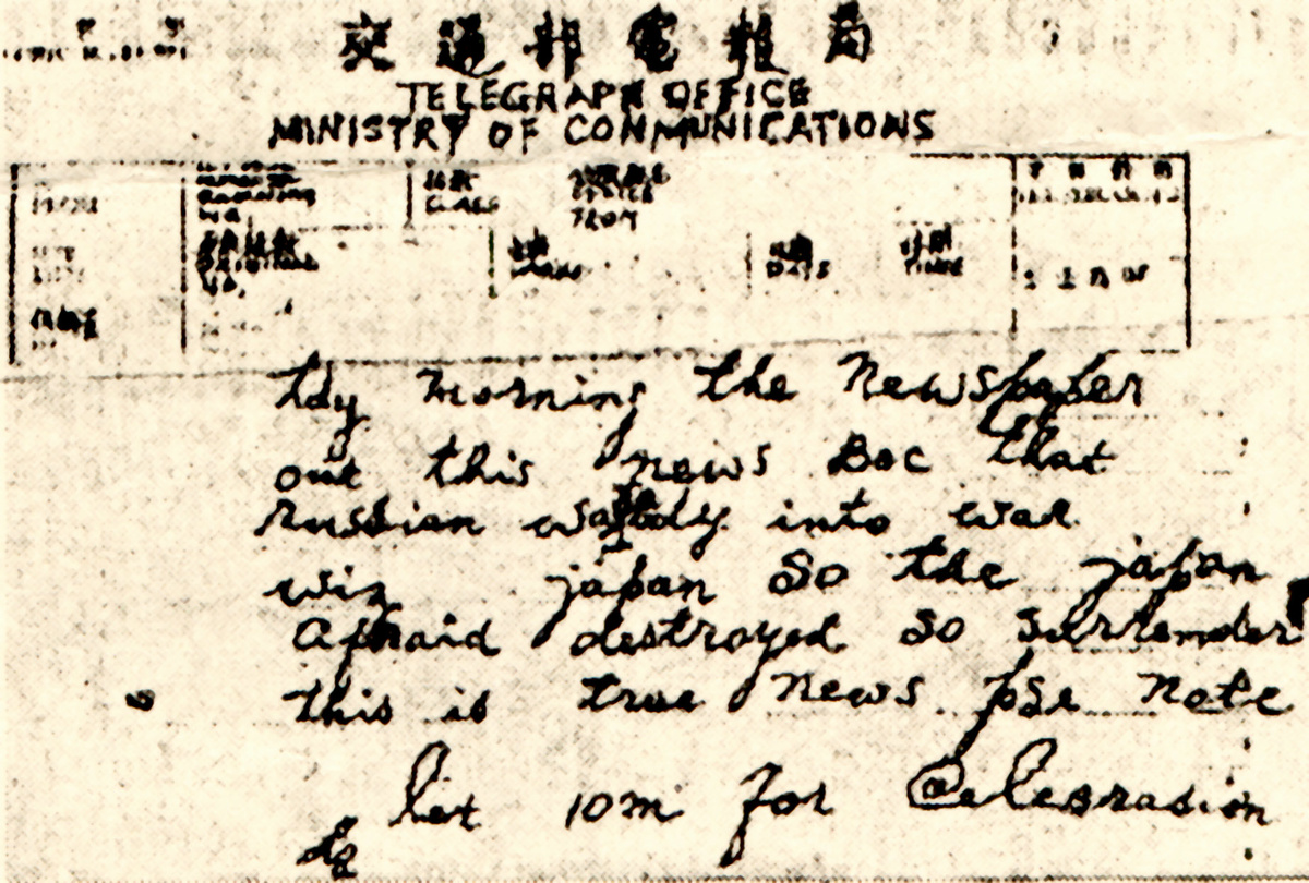 1945年8月由西安发往成都告知抗战胜利消息的电报。内容为:“今晨从报纸上得知,苏军对日作战获胜。日军害怕覆灭所以投降,此消息千真万确。让我们停止工作十分钟来庆祝胜利!”