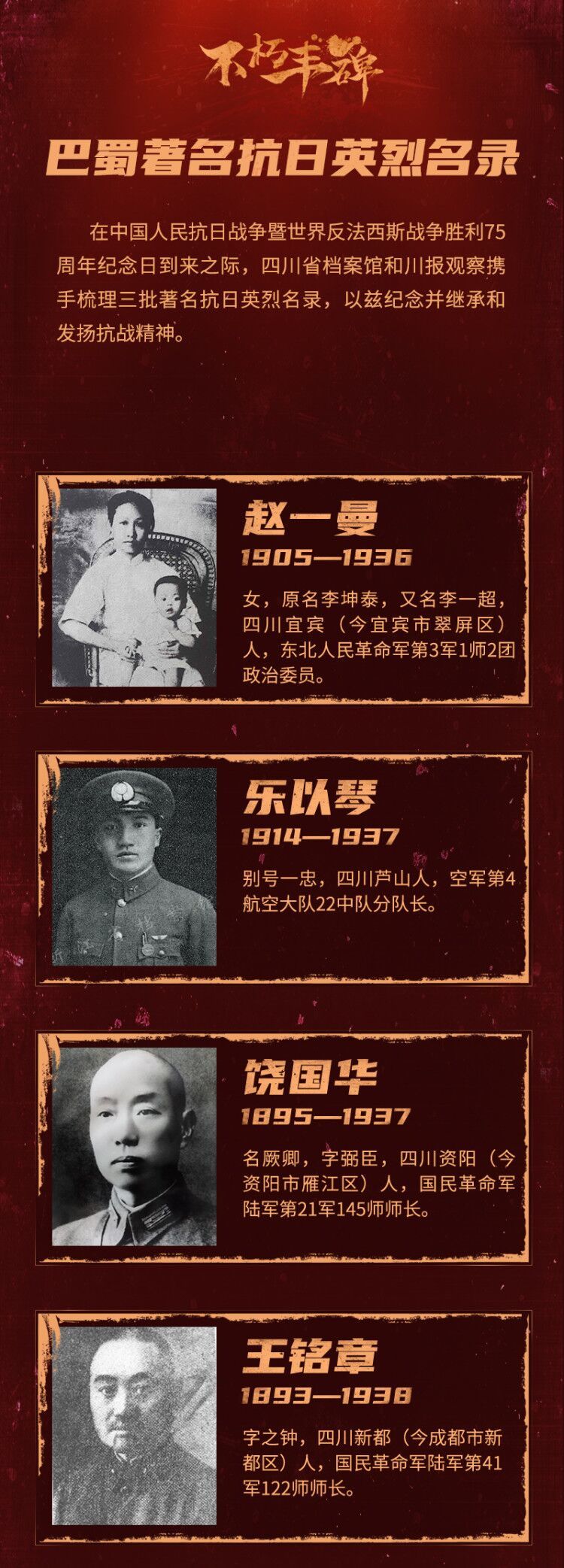 川报观察携手省档案馆在此撷取入选国家第一批、第二批和第三批著名抗日英烈和英雄群体名录中的巴蜀将士名录,梳理英烈事迹的有关档案资料,以兹纪念并继承和发扬抗战精神。