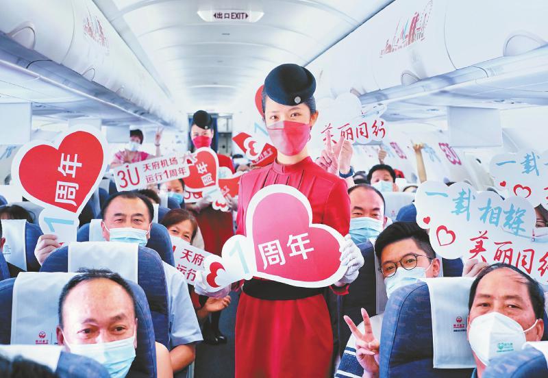 “旅客朋友们,去年的今天,成都天府国际机场正式开航。川航从执飞首航航班到今天,在天府国际机场运营已满一年。一路走来,感谢您的支持……”6月27日,从成都天府国际机场(以下简称“天府机场”)飞出的航班上,四川航空股份有限公司(以下简称“川航”)开展了“一载相辉、美丽同行”主题活动,与旅客共同为天府机场送上“生日”祝福。