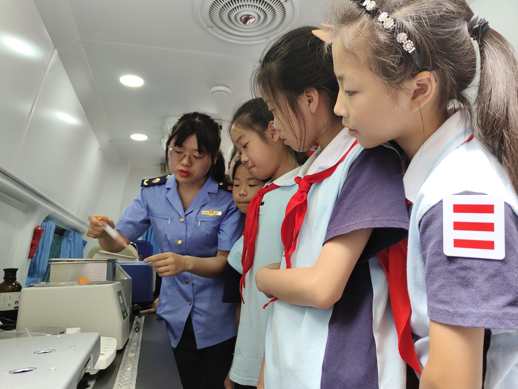 成都市锦江区市场监管局监管人员向学生科普食品快检知识。