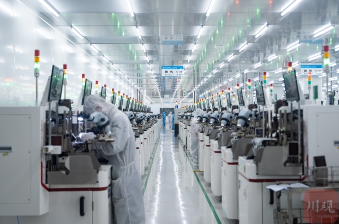 开工现场8公里之外,内江高新区白马园区的四川明泰微电子生产车间内,工人穿梭在排列密集分布的产线设备中间,一件件微电子产品在机械设备的操作下接连成型,将用于下游厂商的显示器产品的制造,日产量可达2000万只。