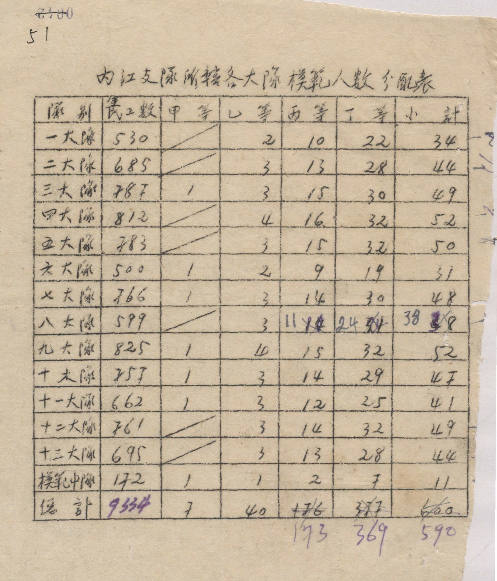 筑路队伍模范人数分配表。 图据东兴区档案馆