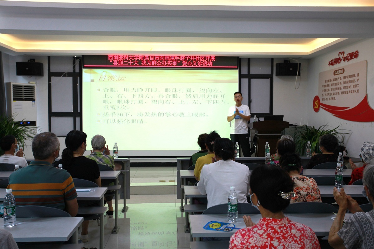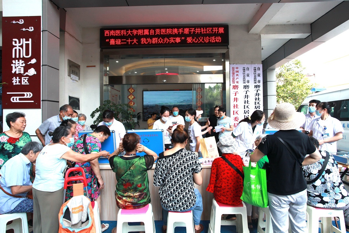 当日,磨子井社区党委联合西南医科大学附属自贡医院举办“喜迎党的二十大 我为群众办实事”爱心义诊系列活动,把关爱和健康送到居民群众身边。