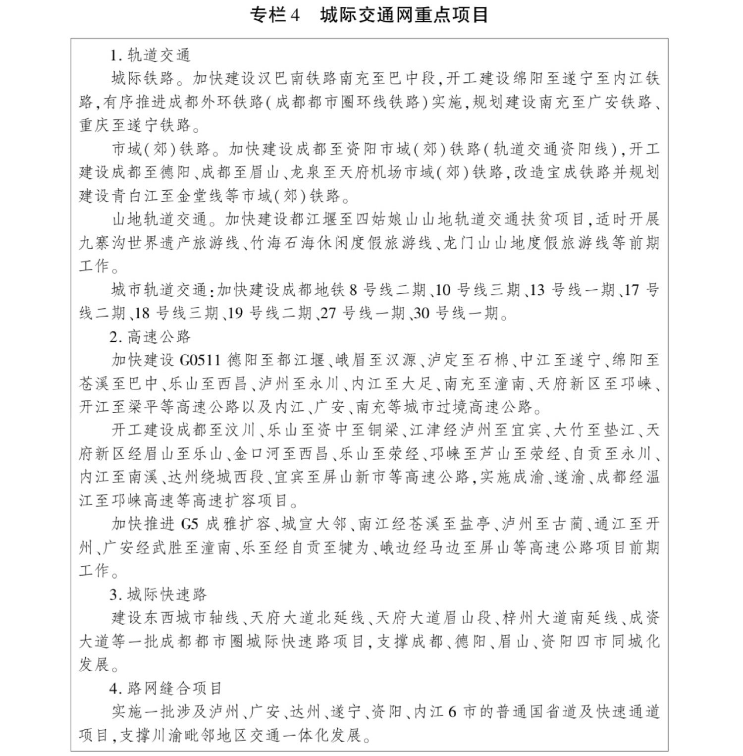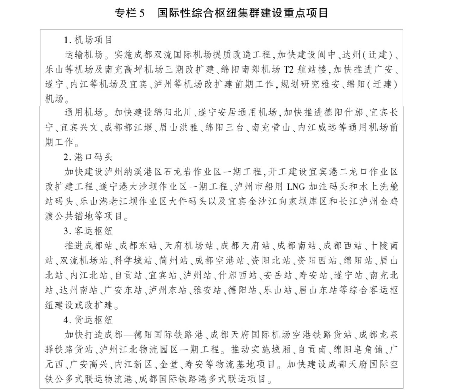 《规划》提出,将重点实施畅通多向进出川运输通道、完善双核辐射综合交通网、建设高水平国际枢纽集群、打造高品质出行服务体系、构建高效率货运物流体系、打造全国智能交通新高地、提升交通绿色安全发展水平、创建一体化协同治理样板等8项重点任务。