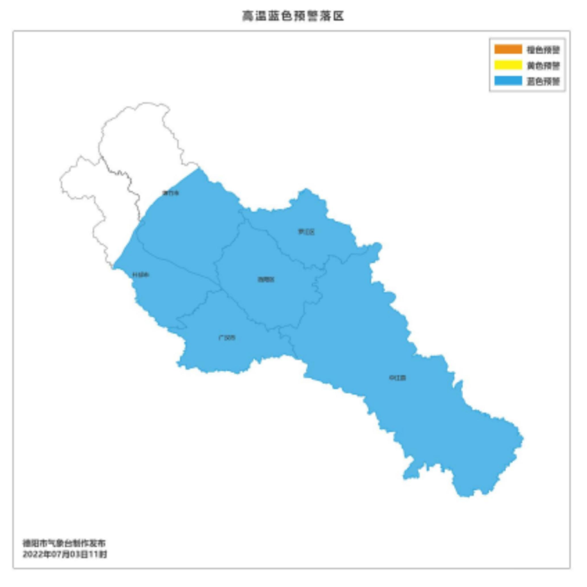 目前,南充发布高温黄色预警,成都、德阳、乐山、绵阳等4市和部分县级气象台发布了高温蓝色预警↘