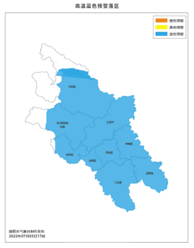 截至记者发稿,乐山市犍为县、马边县、夹江县、沐川县、峨边彝族自治县、峨眉山市、五通桥区,绵阳江油市、安州区、三台县、盐亭县、梓潼县先后发布了高温蓝色预警。南充市仪陇县、高坪区、阆中市、蓬安县、南部县、营山县先后发布了高温黄色预警。