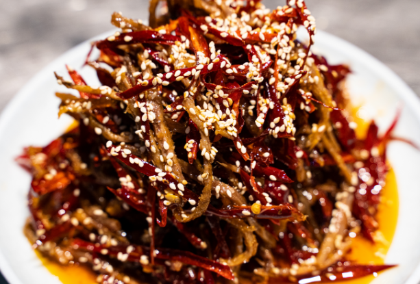 “我们店里招牌就是牛肉丝,一天只有五十斤。”面对一桌子美食,柳雯英首先推荐的就是酒窝牛肉丝,牛肉丝配上辣椒丝,一盘菜好不红火。她介绍道,这道菜纯手工制作,牛肉和辣椒都是人工用剪刀剪的,制作很花时间。除了可以堂食、打包,还可以抽真空进行邮寄。