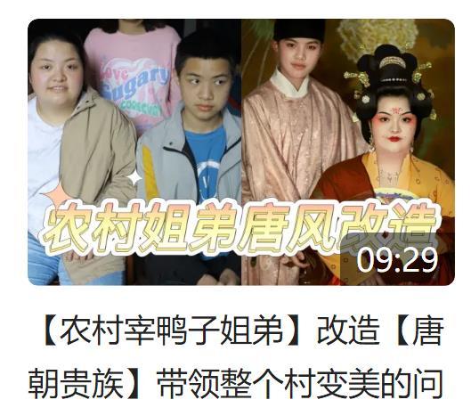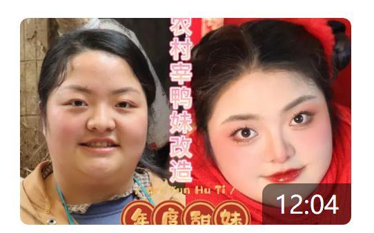 比如,一对在菜市场宰鸭子的农村姐弟,姐姐长得比较丰腴大气,胖胖的很可爱,刘润瞬间觉得姐姐很像唐代仕女图里的美人。于是她为这个姐姐画了淡淡的柳叶眉,配上淡红色的眼影,额头点染上红色的花瓣,涂上红色的樱桃唇,嘴唇两边还有酒窝,配上唐代特有的发髻和发簪,引得不少网友在弹幕上留言:“其实姐姐五官本来就好好看!现在看更可爱了。”这样的妆容,配上唐代的齐胸襦裙,就像一个可爱的仕女。