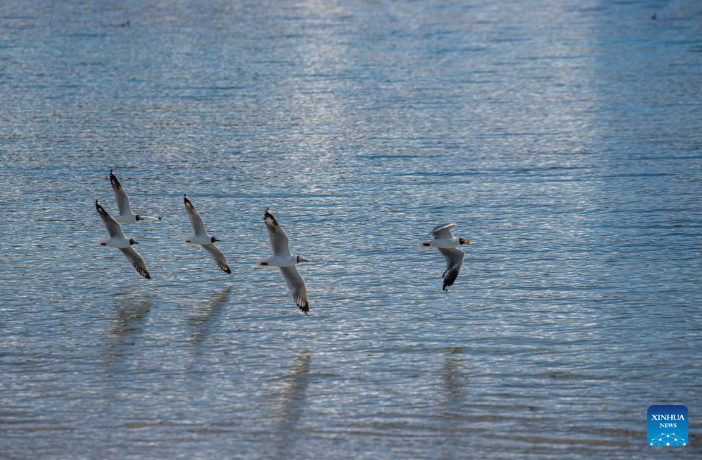 Waterfowls fly over the surface of the Yamdrok Lake in Nagarze County of Shannan City, southwest China's Tibet Autonomous Region, July 2, 2022. (Xinhua/Sun Fei)