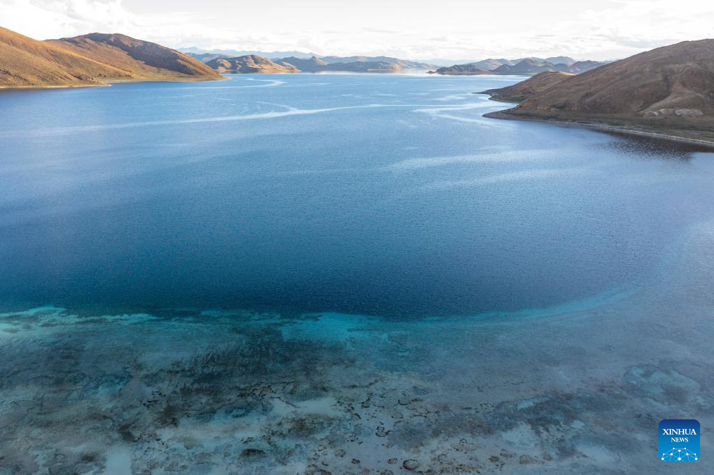 Photo taken on July 2, 2022 shows the scenery of the Yamdrok Lake in Nagarze County of Shannan City, southwest China's Tibet Autonomous Region. (Xinhua/Sun Fei)