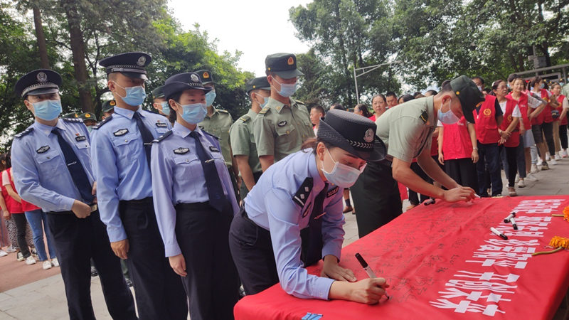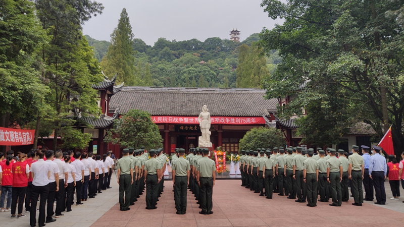 当天,来自宜宾市机关、企业,部队的近200人怀着无比崇敬的心情,聚集到赵一曼革命烈士塑像前,参加赵一曼纪念馆与全国其他抗战类纪念馆同步举行的纪念中国抗日战争暨世界反法西斯战争胜利75周年活动,为所有在抗日战争中牺牲的革命先烈和死难同胞敬献花篮、默哀,聆听革命故事、缅怀革命先烈,并郑重在"铭记历史 缅怀先烈 珍爱和平 开创未来"横幅上签名。