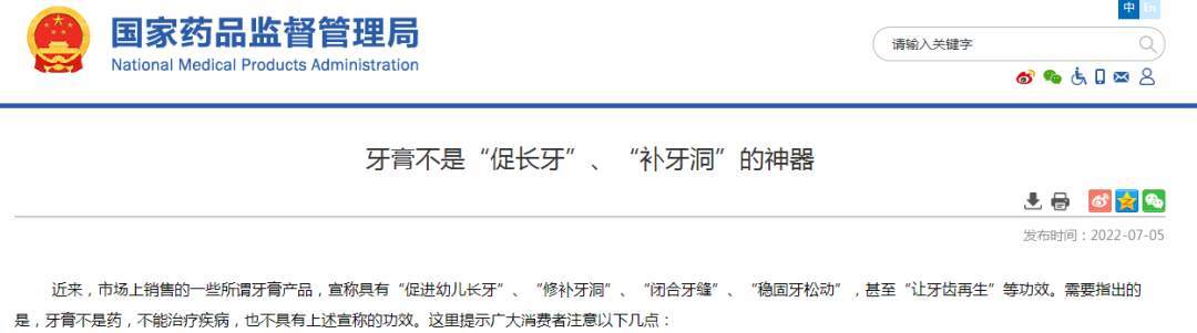 近来,市场上销售的一些所谓牙膏产品,宣称具有“促进幼儿长牙”、“修补牙洞”、“闭合牙缝”、“稳固牙松动”,甚至“让牙齿再生”等功效。需要指出的是,牙膏不是药,不能治疗疾病,也不具有上述宣称的功效。这里提示广大消费者注意以下几点:
