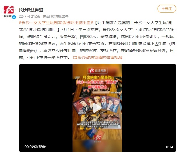 7月1日下午三点左右,长沙22岁女大学生小彤在玩“剧本杀”的时候,被吓得全身无力,头晕气促,四肢麻木,感觉减退,休息后小彤还是如此,一起玩的同伴赶紧将其送医,医生迅速为小彤完善检查:右侧额顶叶出血,蛛网膜下腔出血(脑血管畸形),急诊立即开展止血、护脑等对症支持治疗,并邀请相关科室专家会诊,目前,小彤正在进一步治疗中。