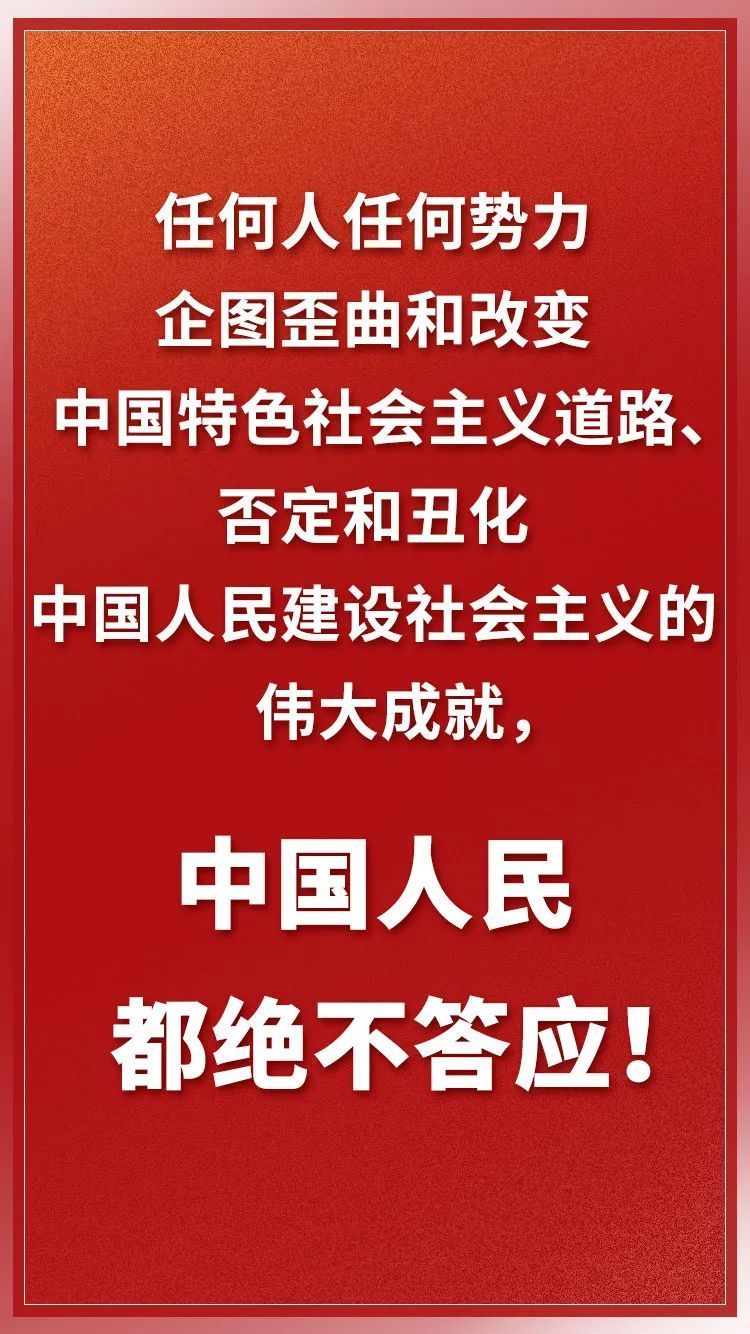 ——实现中华民族伟大复兴,必须坚持走中国特色社会主义道路。道路问题直接关系党和人民事业兴衰成败。中国特色社会主义道路是党和人民历经千辛万苦、克服千难万险取得的宝贵成果。中国特色社会主义道路,开拓于中国人民共同奋斗,扎根于中华大地,是给中国人民带来幸福安宁的正确道路。无论遇到什么风浪,在坚持中国特色社会主义道路这个根本问题上都要一以贯之,决不因各种杂音噪音而改弦更张。随着新时代坚持和发展中国特色社会主义的伟大实践不断向前,我们的道路必将越走越宽广,我们的制度必将越来越成熟。任何人任何势力企图歪曲和改变中国特色社会主义道路、否定和丑化中国人民建设社会主义的伟大成就,中国人民都绝不答应!