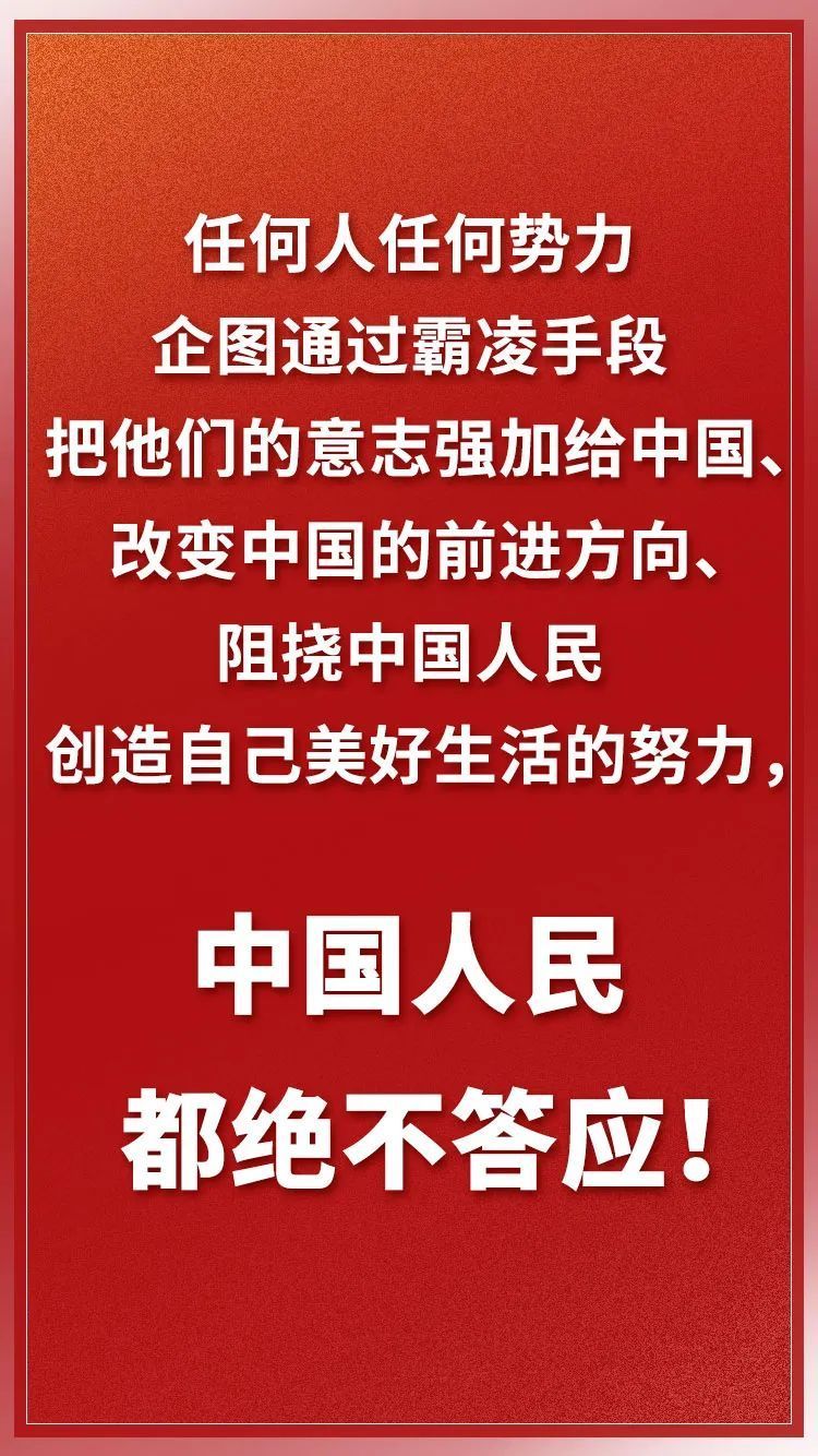 ——实现中华民族伟大复兴,必须坚持斗争精神。中国共产党和中国人民是在斗争中成长和壮大起来的,斗争精神贯穿于中国革命、建设、改革各个时期。我国正处于实现中华民族伟大复兴关键时期,改革发展正处在攻坚克难的重要阶段,在前进道路上,我们面临的重大斗争不会少。我们必须以越是艰险越向前的精神奋勇搏击、迎难而上。凡是危害中国共产党领导和我国社会主义制度的各种风险挑战,凡是危害我国主权、安全、发展利益的各种风险挑战,凡是危害我国核心利益和重大原则的各种风险挑战,凡是危害我国人民根本利益的各种风险挑战,凡是危害我国实现“两个一百年”奋斗目标、实现中华民族伟大复兴的各种风险挑战,只要来了,我们就必须进行坚决斗争,毫不动摇,毫不退缩,直至取得胜利。历史必将证明,中华民族走向伟大复兴的历史脚步是不可阻挡的。任何人任何势力企图通过霸凌手段把他们的意志强加给中国、改变中国的前进方向、阻挠中国人民创造自己美好生活的努力,中国人民都绝不答应!