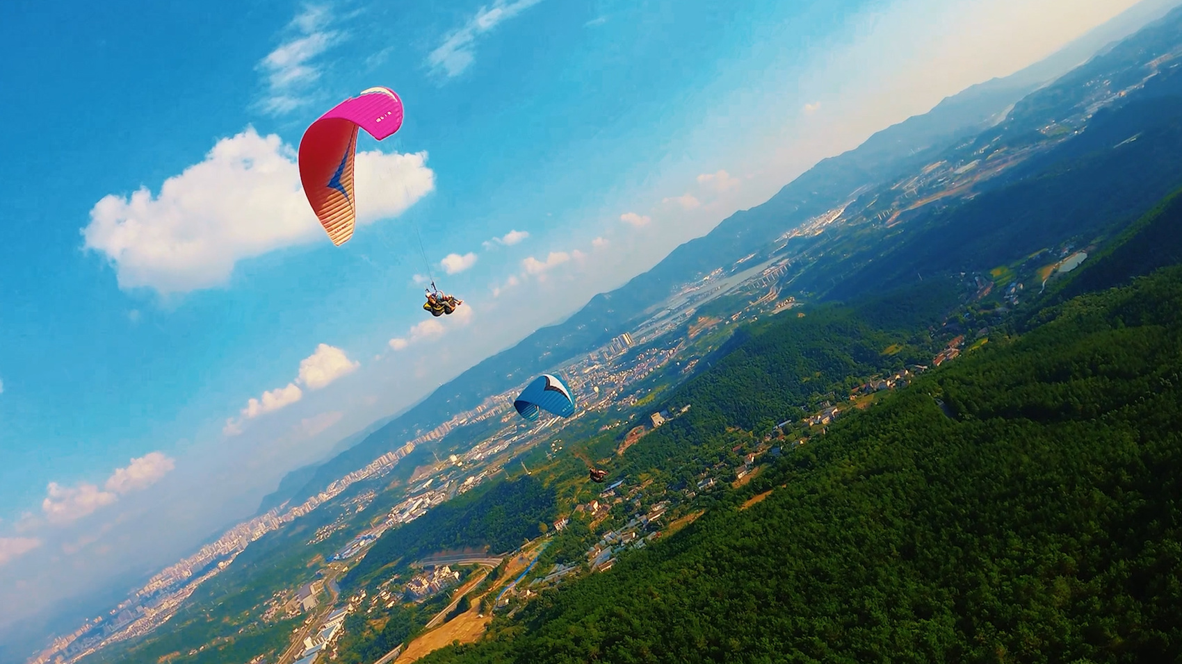 起跑、控伞、加速、飞出……坐上这辆“空中敞篷车”,这一刻,眼里只有山川湖泊,蓝天白云近在咫尺。