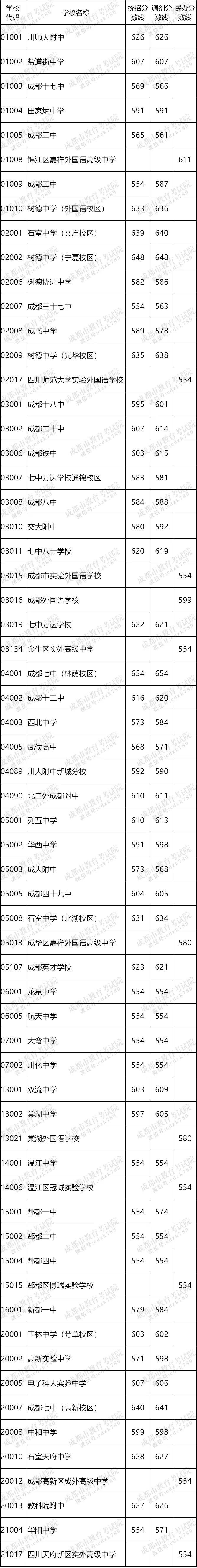 据了解,树德中学(宁夏校区)统招、调招均为648分;树德中学(外国语校区)统招633分、调招636分;石室中学(文庙校区)统招639分、调招640分;树德中学(光华校区)统招635分、调招638分);石室中学(北湖校区)统招631分、调招634分;成都七中(高新校区)统招640分,调招641分。