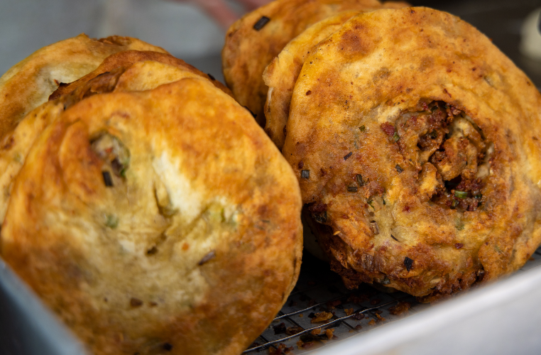 在高温的作用下,白色面饼颜色逐渐加深,待煎至两面焦黄,锅盔又放入锅下的炉火旁烘烤,将肉馅烤熟、去油。和面加煎烤,8分钟左右,色泽金黄、酥脆焦香的锅盔就出炉了。趁着热气咬上一口,酥脆的外皮、喷香的肉馅在口腔混合,鲜香无比,越嚼越有味儿。