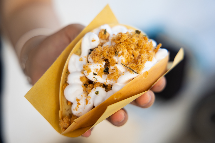 虽然老板有语言功能障碍,但是并不妨碍吃货们对美食的追捧。只见老板在小铜盘上倒一半面糊,盖上盖便静静等候美味的诞生。新鲜出炉的蛋烘糕,金黄绵软,加上经典的奶油和肉松,轻轻咬上一口,香味在口中弥漫,味蕾瞬间得到满足。