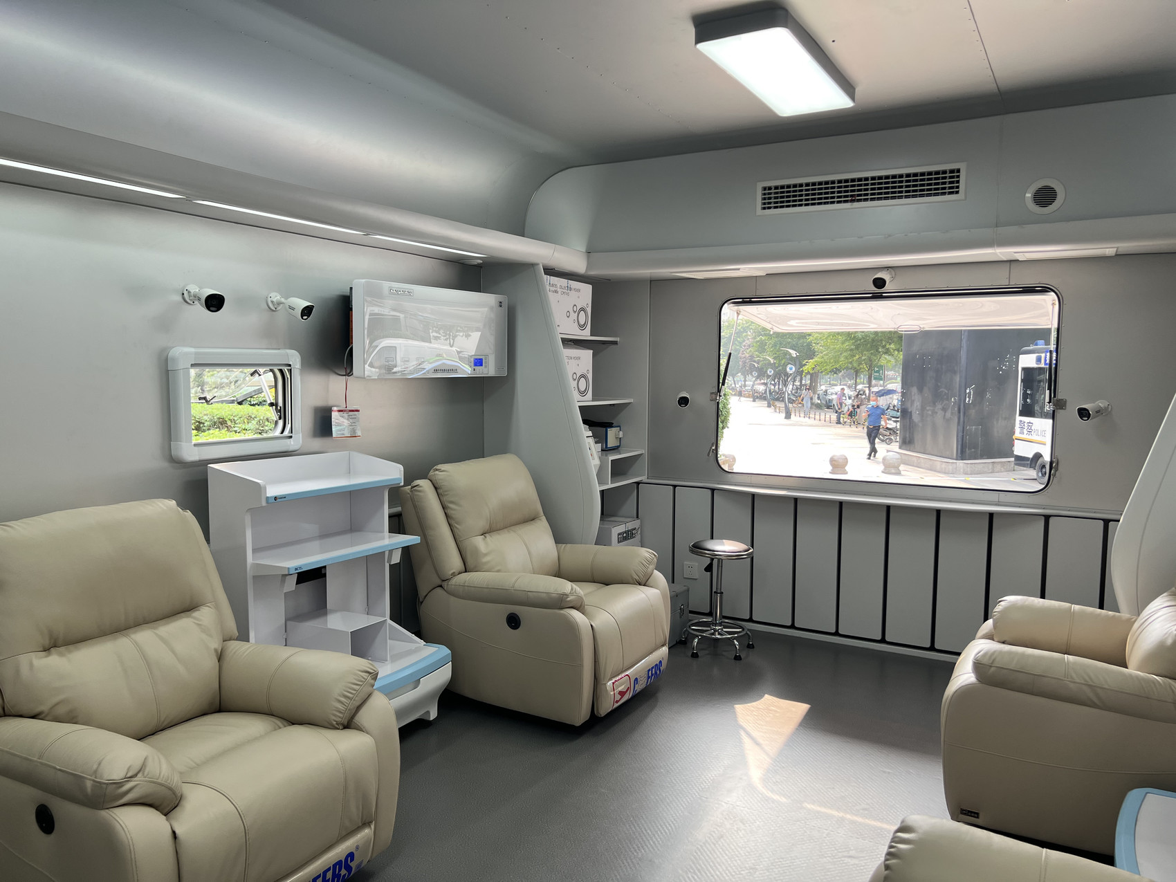 川观新闻记者在试运行期间进入献血太空舱,发现这个长约11.2米、宽约3.6米的白色献血房车大有乾坤—— 舱内,迎面是一台可记录献血全过程短视频的电子触摸屏,四张可自动伸缩的米白色大沙发,小冰箱里放满冰镇饮料,体检区域还设计了可推拉的遮挡门。